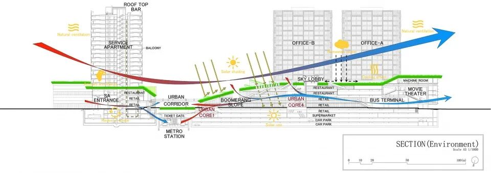 这是一个峡谷形态的建筑拓扑型,建筑面积30万平方米,项目场地中心设计有一条宽阔的绿道(景观绿带)。