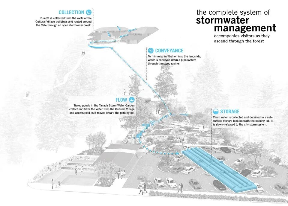 综合雨水处理系统:完整而美观的雨水管理系统旨在限制可能加速滑坡的雨水渗透,游客在森林中攀升的过程中将穿越不同类型的雨水花园和景观。