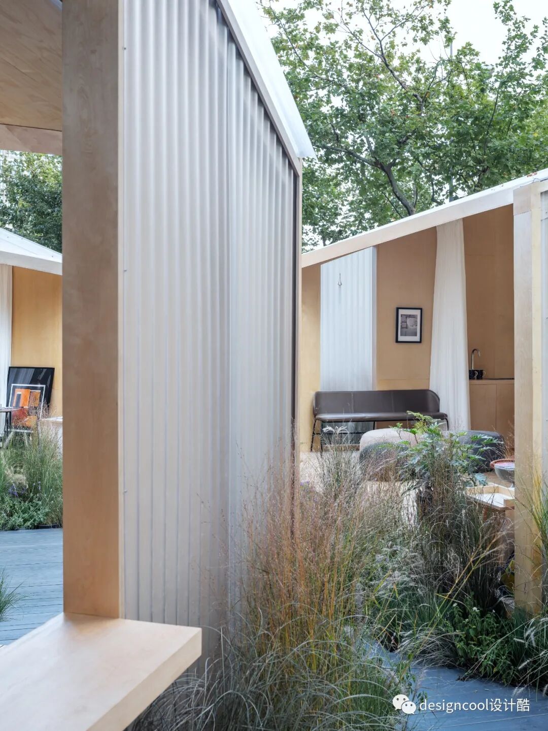 Plywood and the frosted corrugated panels give the installation facade a contrast and a fusion of inside and outside, real and virtual, between the two planes. By reversing the structural design to expose the keel, the interior facade is tidied up, while the vertical keel reflects the vertical growth pattern of the trees around the base. In addition, the three rooms have additional window openings at certain points on the facade to enhance the feeling of permeability and bring more natural light inside. Several coherent visual bands are formed between each group of window openings. The atmosphere of "home" is released and overlaps with plants and urban scenes that arouse curiosity and imagination of passing "spectators".