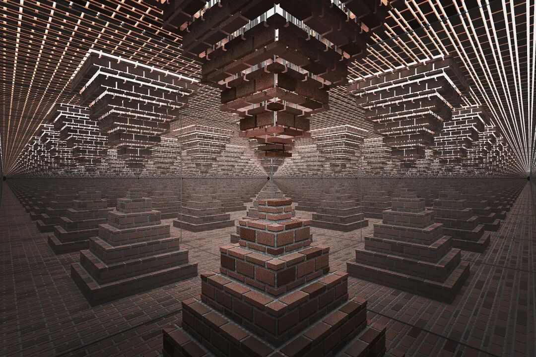 在此次“材料的可能性”空间装置展中,孟凡浩将以砖作为主材,呈现一个具有“科幻感”和“纪念性”的立方体空间:外部的砖以彼此分离的方式构成垂帘式的表皮,内部两个四棱锥彼此相对,正立的四棱锥以传统砌砖的方式构成,倒立的四棱锥则通过技术手段,以反重力的状态抗衡着砖材本身的稳定性能;走进立方体,四周被镜面包围,中间的四棱锥在反射中形成无限延伸的阵列。