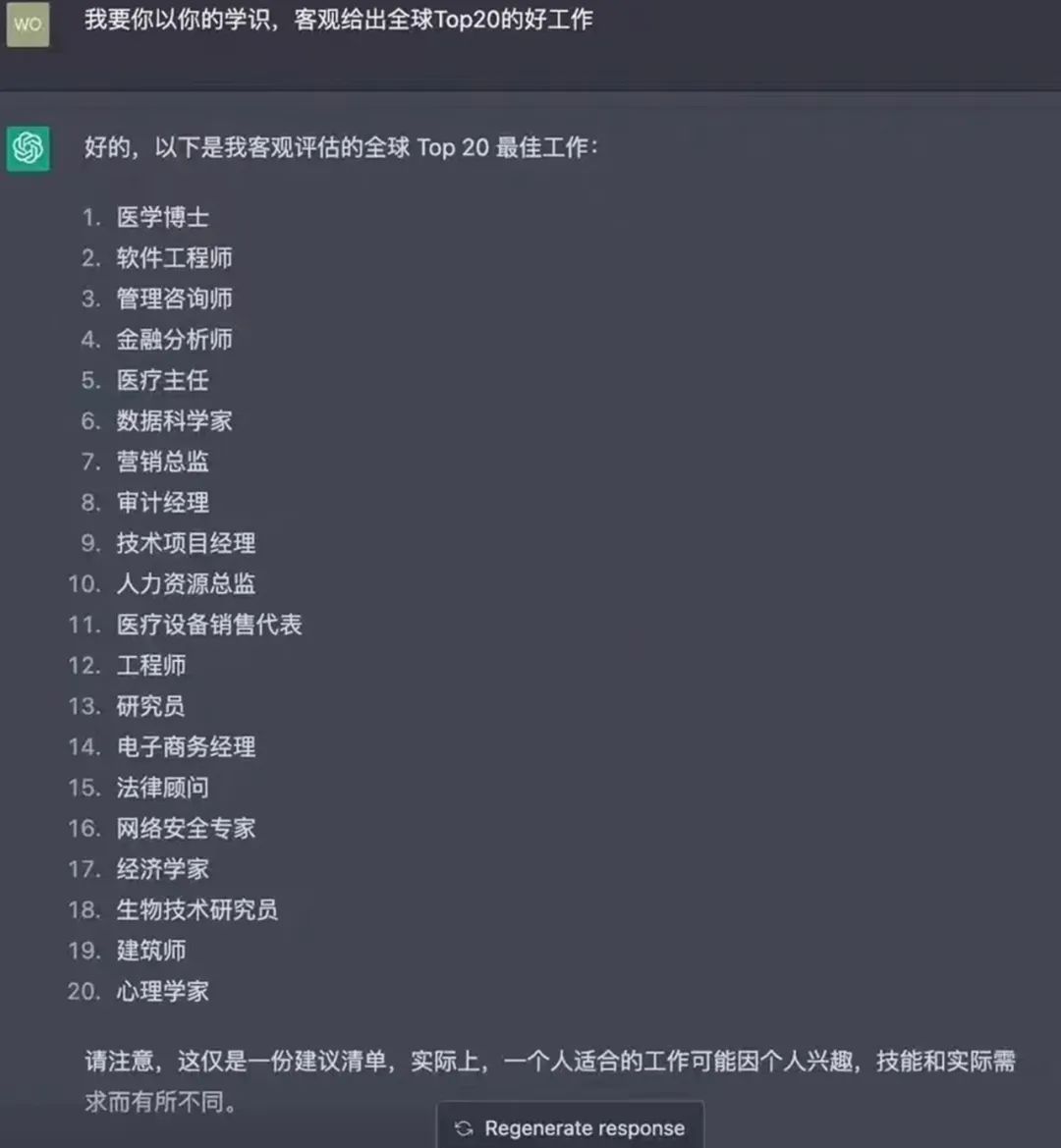 还看到ChatGPT回答的全球Top20最佳工作,建筑师位列19。