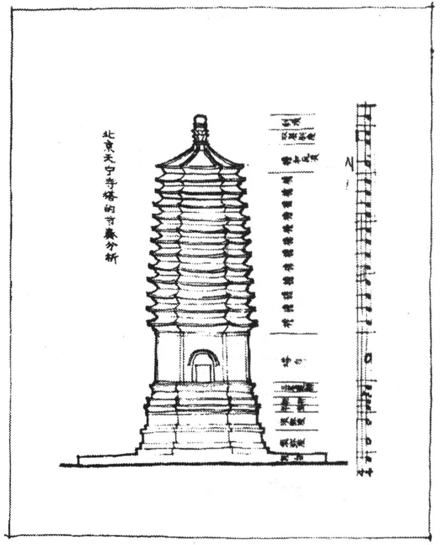 梁思成依照对天宁寺塔的纵向分析得出的层次和高低不同的比例,谱写了一段曲子。