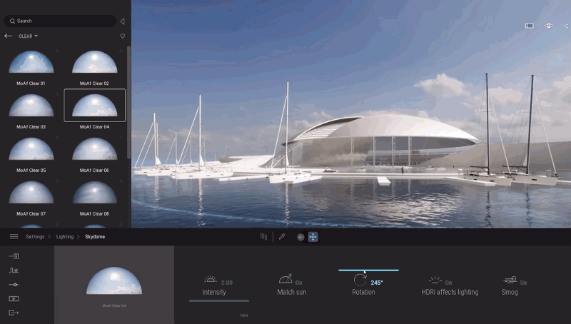 “如果你想要更逼真且多变的天空,2022版的Twinmotion提供了全新的HDRI天空球。当与路径追踪器结合使用时,纹理也将影响场景的光照。你可以从Twinmotion最新内置的庞大天空库中选择纹理——准确地说有285种纹理,每种都提供了2K、4K和8K分辨率,或者你也可以使用自定义的HDRI纹理。” Heinzelmann顿了顿,“我以前用的渲染器,背景图很少。你想换天空背景都是需要自己找HDRI图导入进去,很多时候高清的HDRI都是要付费的,而且导入后各种参数你都需要自己调整,学习成本和时间成本很高!现在有了Twinmotion,你想要什么样的天空背景,鼠标点一点就能换,随心所欲!” Heinzelmann说道。