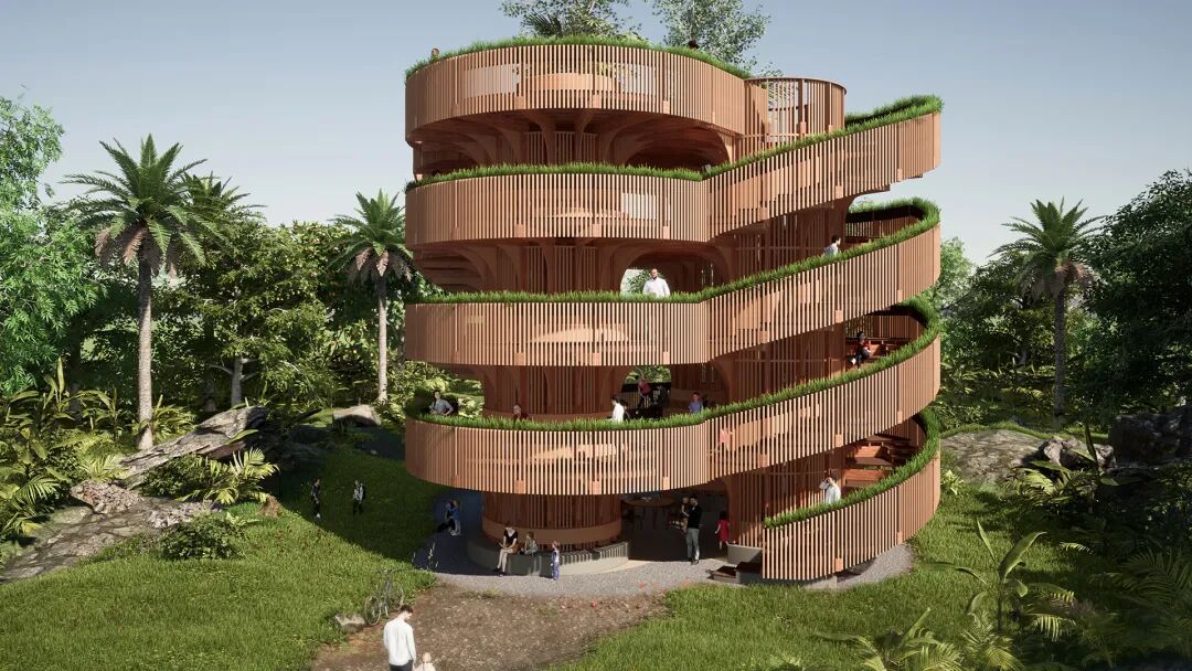 “这是SHAU在万隆设计的斐波那契微型图书馆,它位于西爪哇的Kolam公园,那里是一个潮气氤氲的热带城市。该建筑有着螺旋排列的曲线混凝土肋条和苔藓质地的轻量级屋顶,其设计宗旨就是与自然和树木和谐共存!”Florian Heinzelmann正眉飞色舞地向客户介绍公司最新的项目,他对于说服客户接受大胆的创意颇有心得。