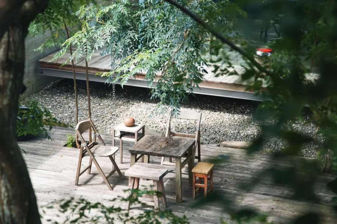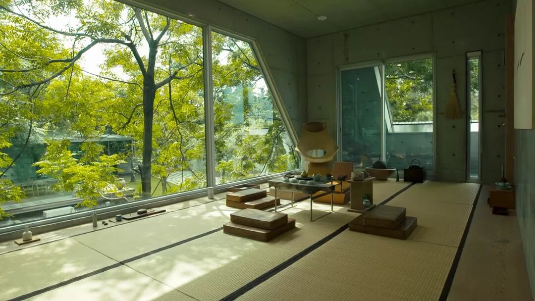 二层是一个榻榻米的茶室,一进来,就会闻到竹藤散发出的独特清香。其中一面墙毛森江用了大面积的落地玻璃,外面是一整片的绿色,仿佛置身森林。