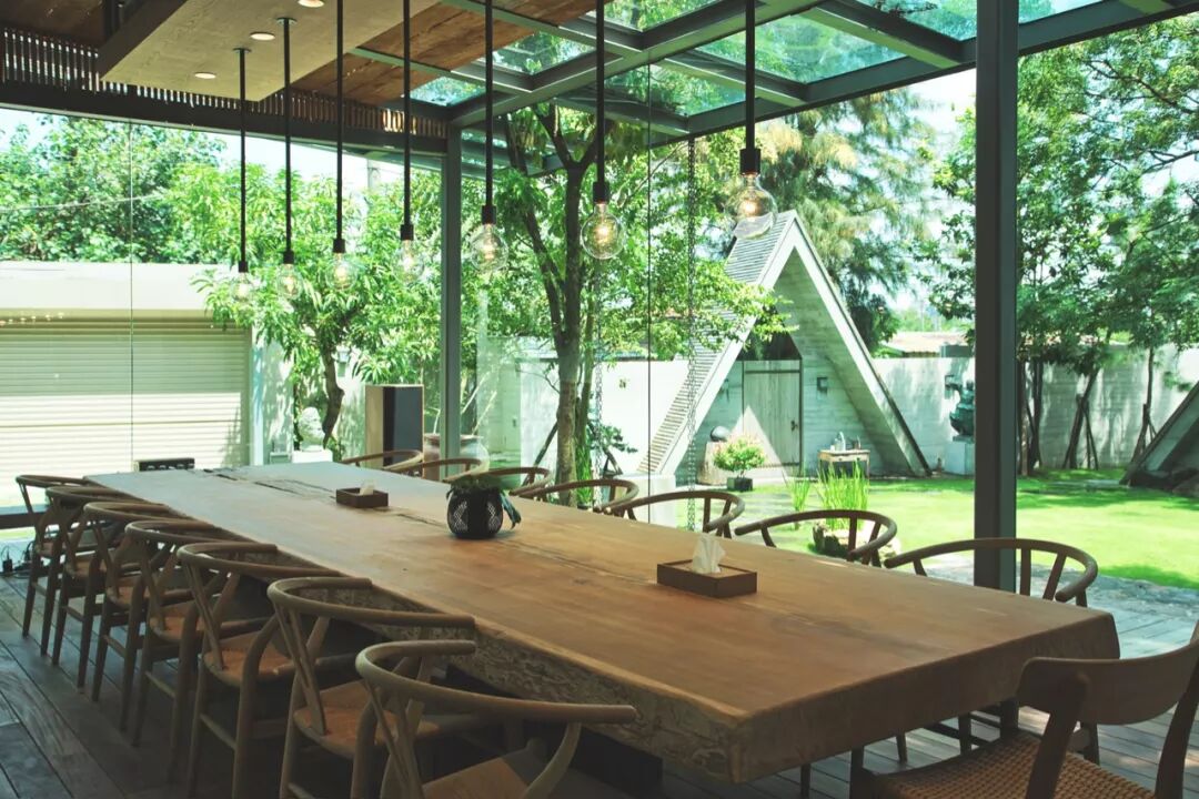 在毛舍的对面也建造了一个20坪(66㎡)的玻璃餐厅。朋友过来拜访,便在餐厅中相聚言欢。