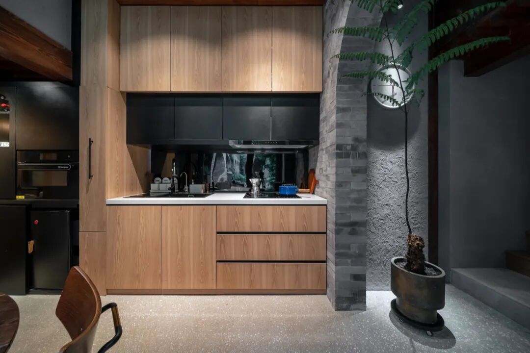 檐口、砖墙木柱等衔接处,藏着“功夫”大厅仍铺了地暖,地面下的保温层约18厘米厚新风机就藏在灶台上方的吊顶内