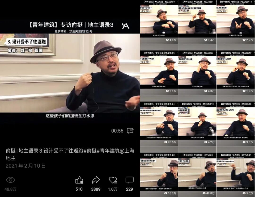 魏一鸣:最近上海某条马路在抖音很火,成了网红打卡的圣地,车企为了宣传自家的新产品,不惜凌晨排队把车停到路边,奉上罚款。由此可见,即便是大公司,也要懂得精细化的宣传,紧跟新媒体的发展。建筑师则更应该借助自媒体的力量,把设计理念通过公众容易理解的方式传递给大众,而不能过于清高。这需要一些媒体思维,特别是自媒体思维,这也是【青年建筑】一直实践,且擅长的领域。两年前,我采访了“上海地主”建筑师俞挺,做成地主语录系列,俞老师犀利、幽默的语言风格获得粉丝青睐。短视频顺应了观众的喜好,这个系列在视频号获得不错的关注,这就是一个很好的案例。