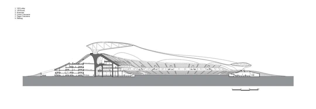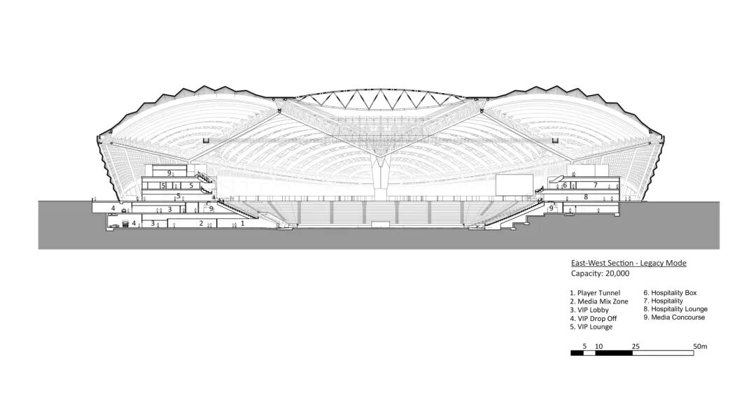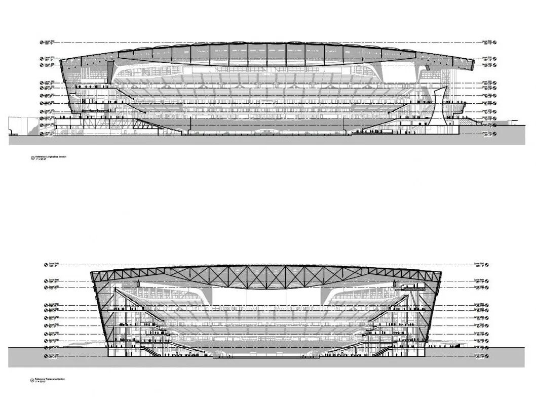 了解体育场馆的关键方法之一是通过剖面图,剖面图是了解观众体验的窗口,它们呈现了人们在空间中移动的流线,展示设计如何为比赛中的运动提供开阔的视野。最近在世界各地建造的体育场的图纸展示了当今的体育设计,有悬臂形式和全封闭结构,它们代表了大跨度解决方案和创新的屋顶设计。