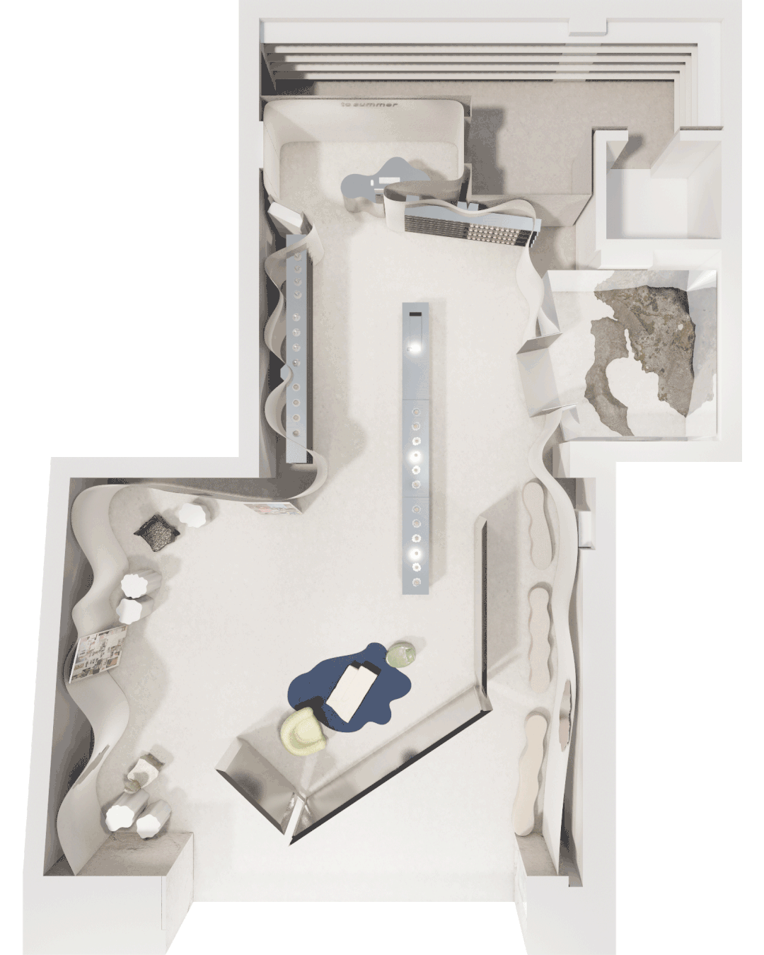 i-Talk:小着的店铺位置非常好,就在巨鹿路758号,那里一直是潮人聚集的网红街区。这个店铺的设计就和观夏完全不同了,当时是如何去消化品牌DNA,又如何用设计手法来表达的呢?