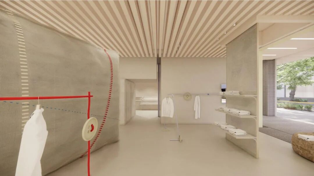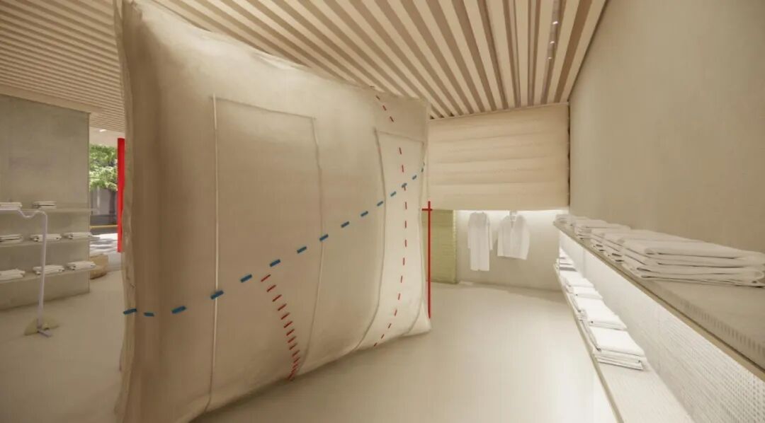小着主打女性日常时装,但没有局限在刻板印象中,在细节上会有小小的设计感,比如收腰的方式,A字版型,或者是袖口和扣子的细节,边缝的处理方式等。我们在这里找到了切入点,把缝线的方式变成某个线索,在空间中呈现缝合的状态。