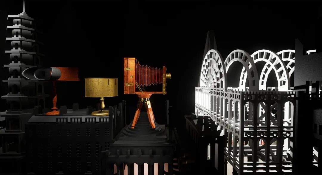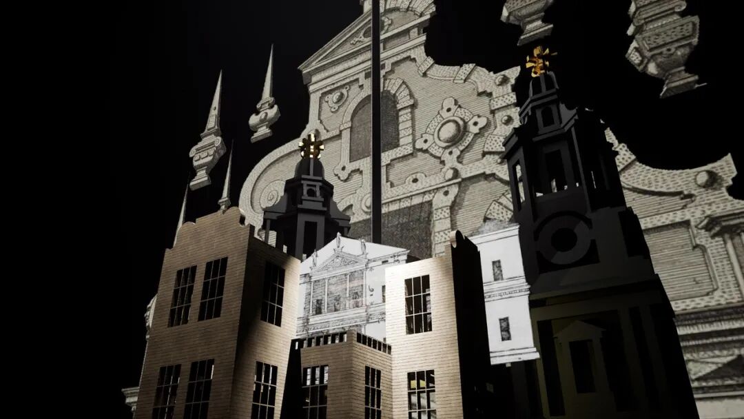 Screenshot from mixed reality film FREESTYLE - ACT 2. Sixteenth to nineteenth century: Printing and photography spread the architectural wonders of the world, 2020.