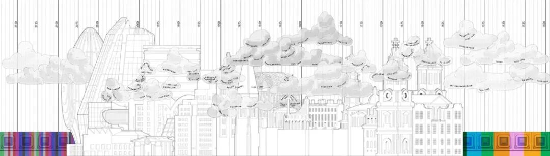 接下来的故事被最初设置设定在混合现实体验中,并根据时间线组织。不同的配色方案和装饰物标志着英国不同风格时期的界限,而具象的主题则说明了几个世纪以来便利人们接触不同媒体形式的机器。沿着时间轴移动,人们可以看到比例1:30物理模型上不同建筑风格的标志性版本,同时阅读地毯上风格密度的逐渐增加。