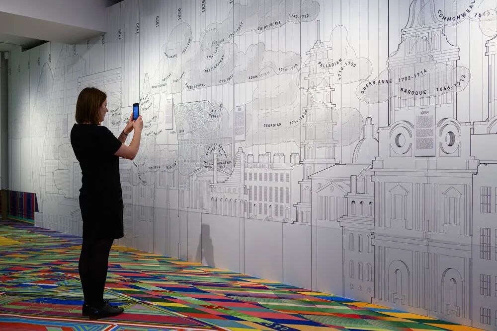 一个英国建筑的大型模型,从RIBA的藏品中抽选出来,描述了这种不同历史风格的转变,而一个信息丰富的地毯说明了与每个风格时代相关的技术工具。