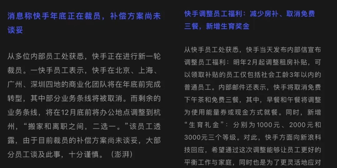 现在回顾到当时的加班费取消,会发现原来一切的“降本增效”其实都有迹可循。在我正在敲这行字的时候,2023年1月,快手已经迎来了第二批裁员。寒冬还在继续。