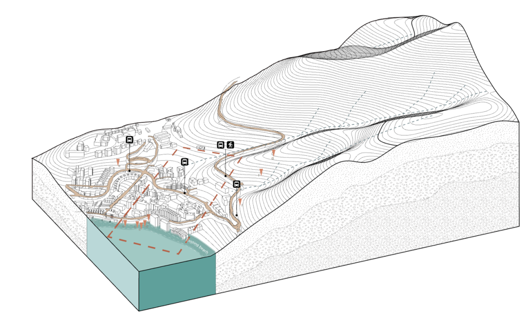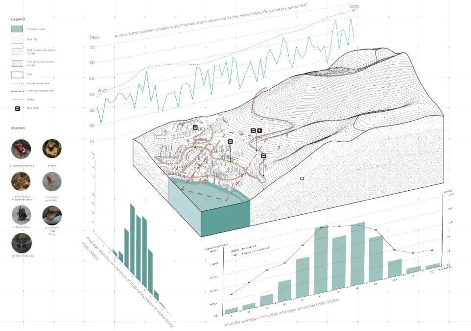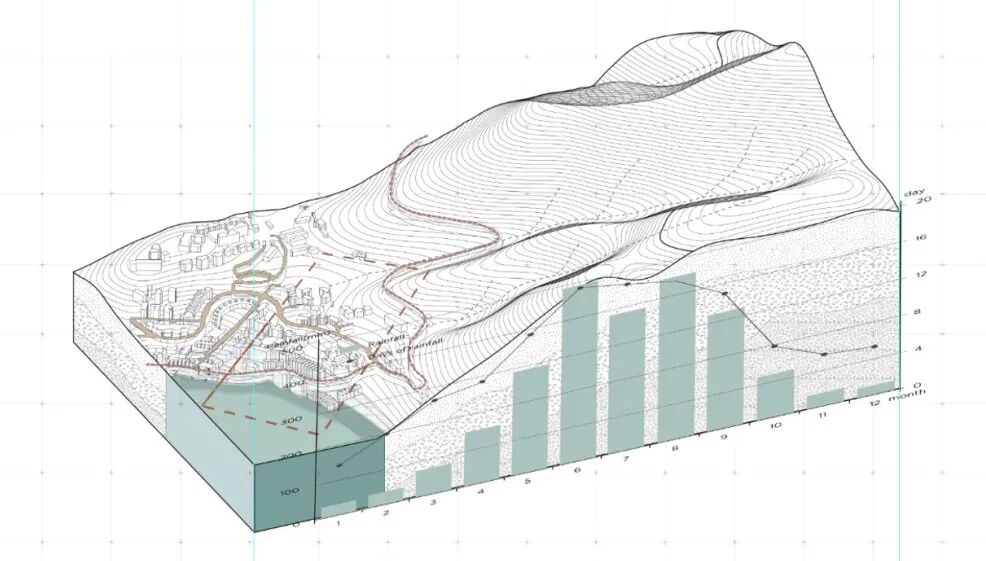 今天分享的主题是绘制关于台风过境对于场地影响的分析图。场地背靠山体,面对海洋,夹在中间的部分不仅会遭遇到台风过境导致的风暴侵袭,陡峭的山体地形也让降雨很容易聚集后续的方案是找到一种合适的策略介入场地,保护人和其他的生物。