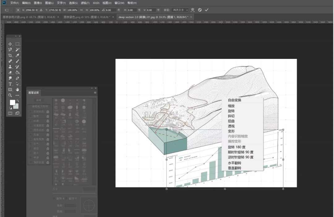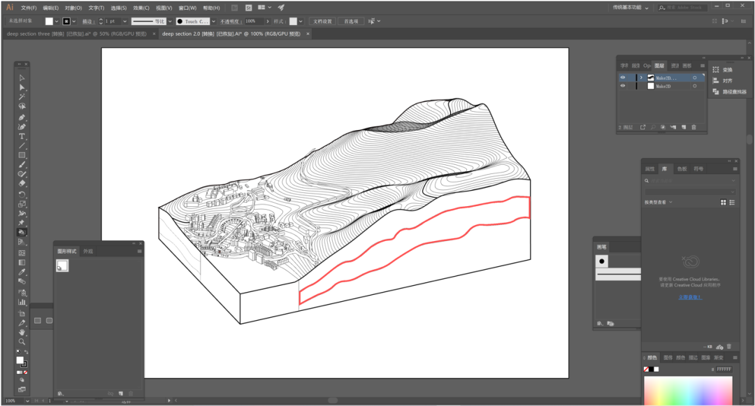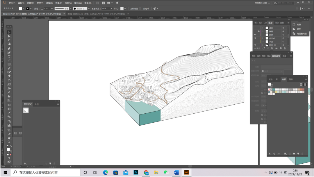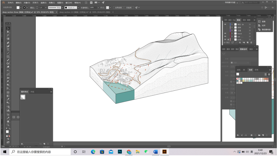 作品集的审核老师每天都会面对无数份作品集,所以必须要让审核老师在最短的时间被吸引眼球同时找到重点。这就要求图面既不可以过于平淡,也不可以由于盲目追求酷炫而忽视了信息的表达。以section形式表达的景观分析图不仅更加直观,也可以利用它的三维特性结合其他表格数据类的信息。
