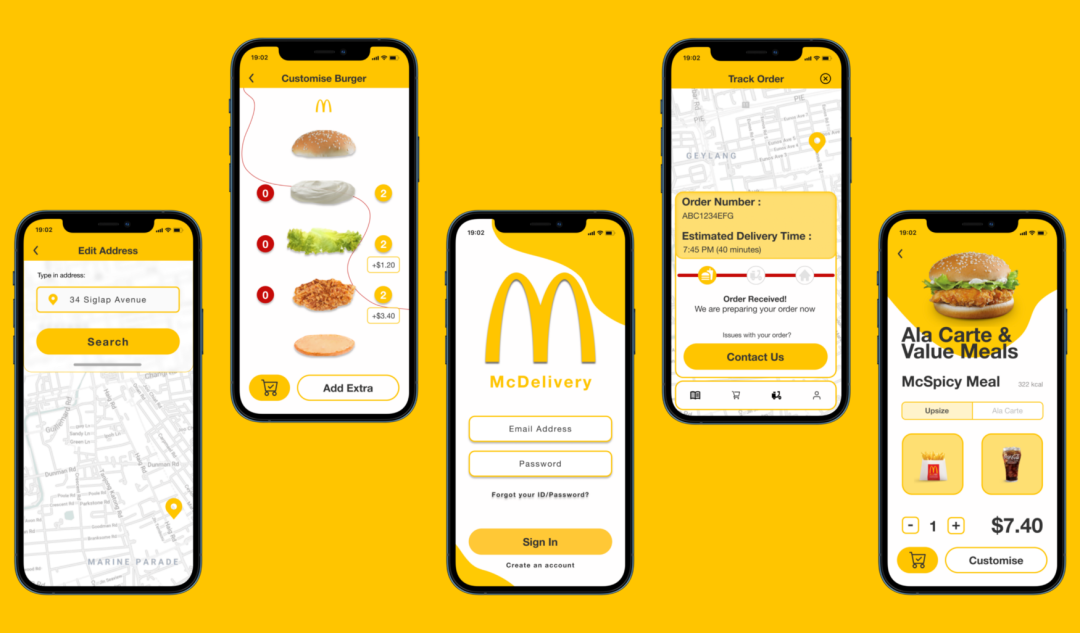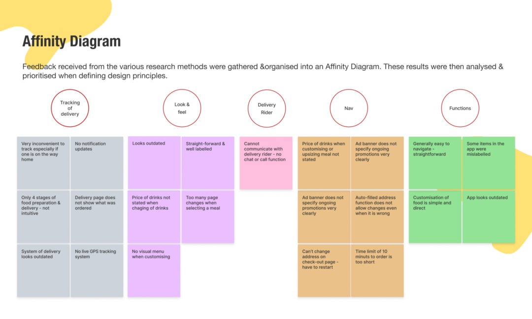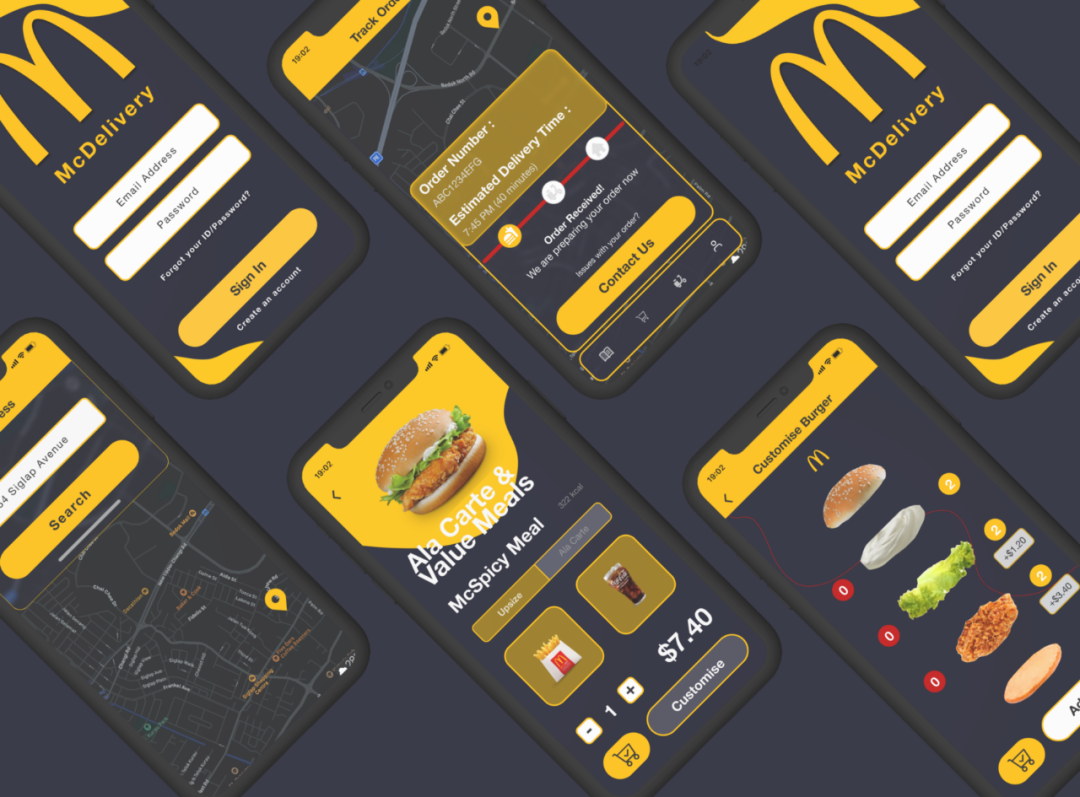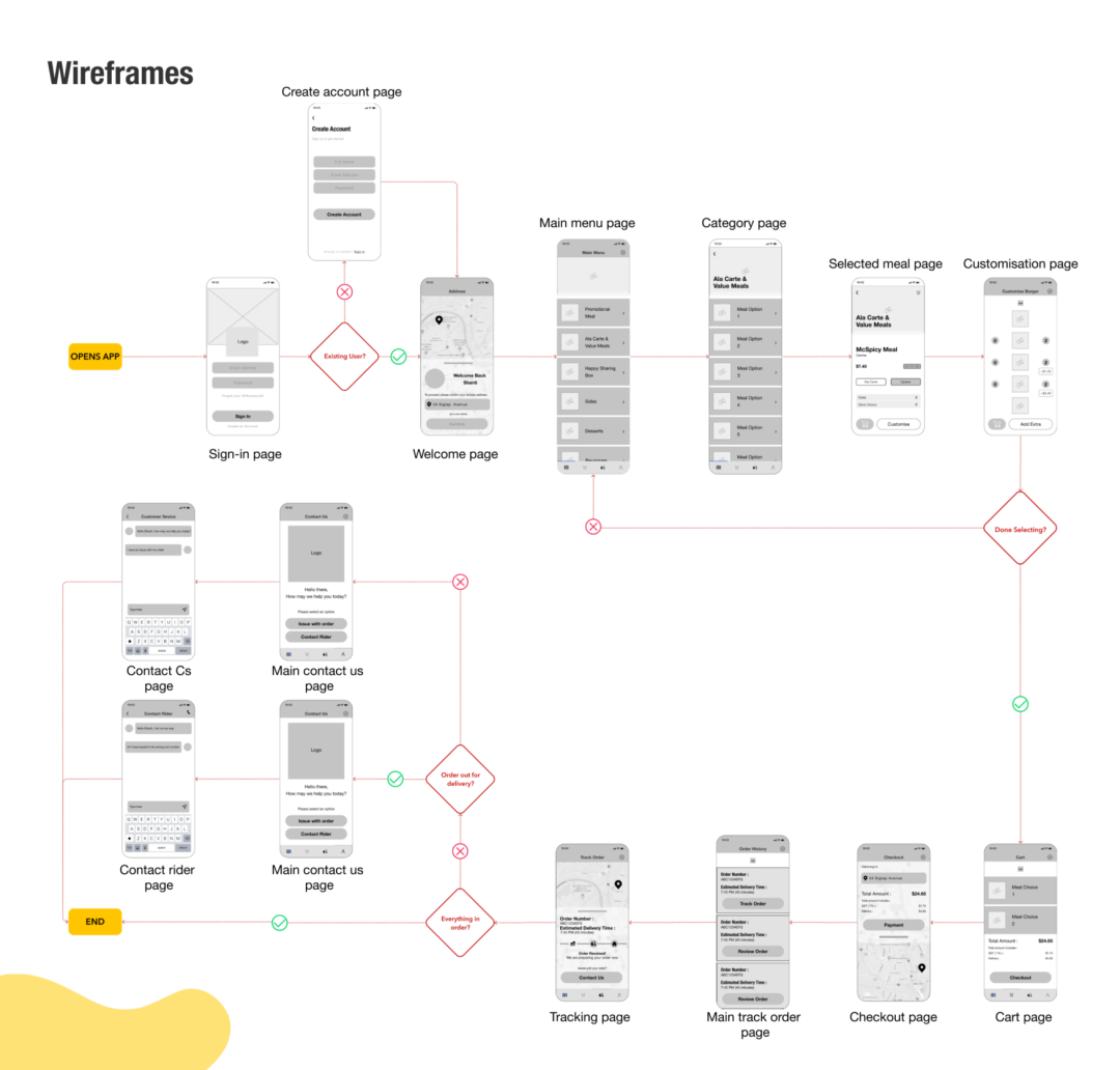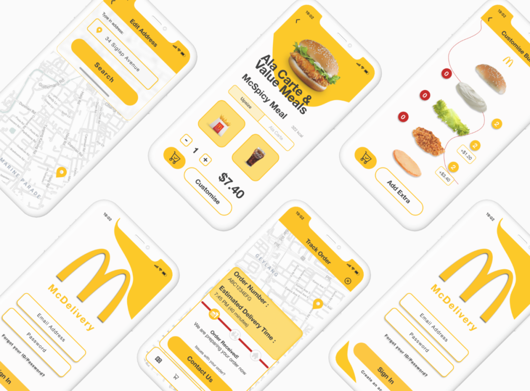 在这一案例中,设计者们作为UX/UI设计师,通过使用各种方法对当前的McDelivery进行研究,并进行了包括竞争分析、亲和图分析、线框图、风格设计等各方面的设计。