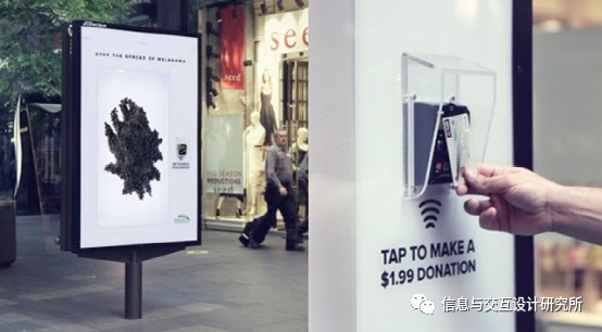 交互设计的广告一定程度上也承担更多的社会价值。JCDecaux的这个户外交互式捐款装置是与澳大利亚的Melanoma Institute Australia (MIA)进行合作,鼓励公民们为对抗黑色素癌而进行的公益捐款。黑色素癌作为澳大利亚的“国癌”,每年有数千名澳大利亚人死于黑色素癌,是全世界发病率最高的国家。这个交互装置通过不断蔓延扩散的黑色素瘤展示了这一癌症的普及性。