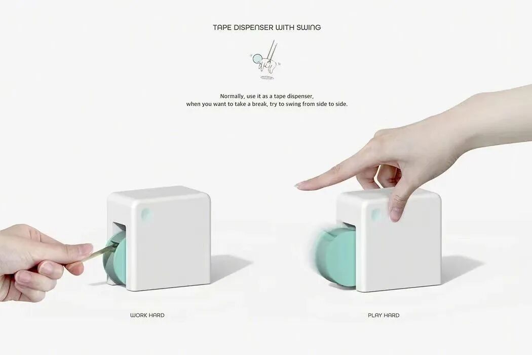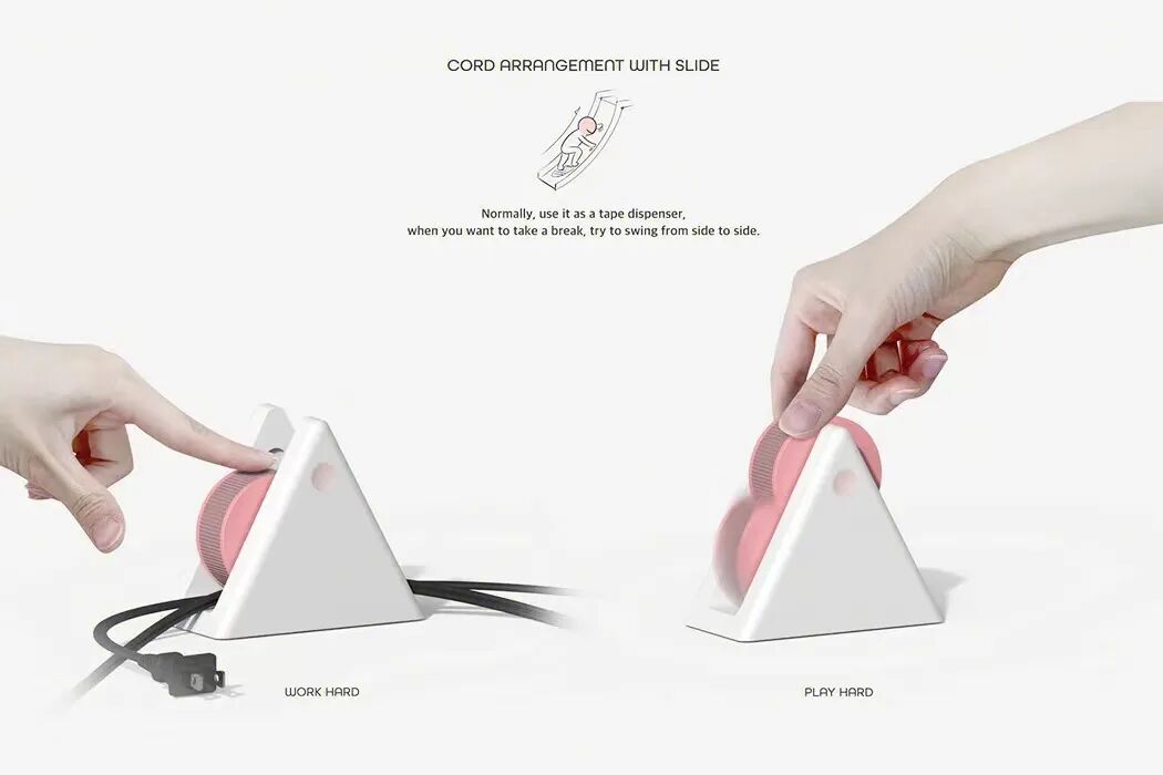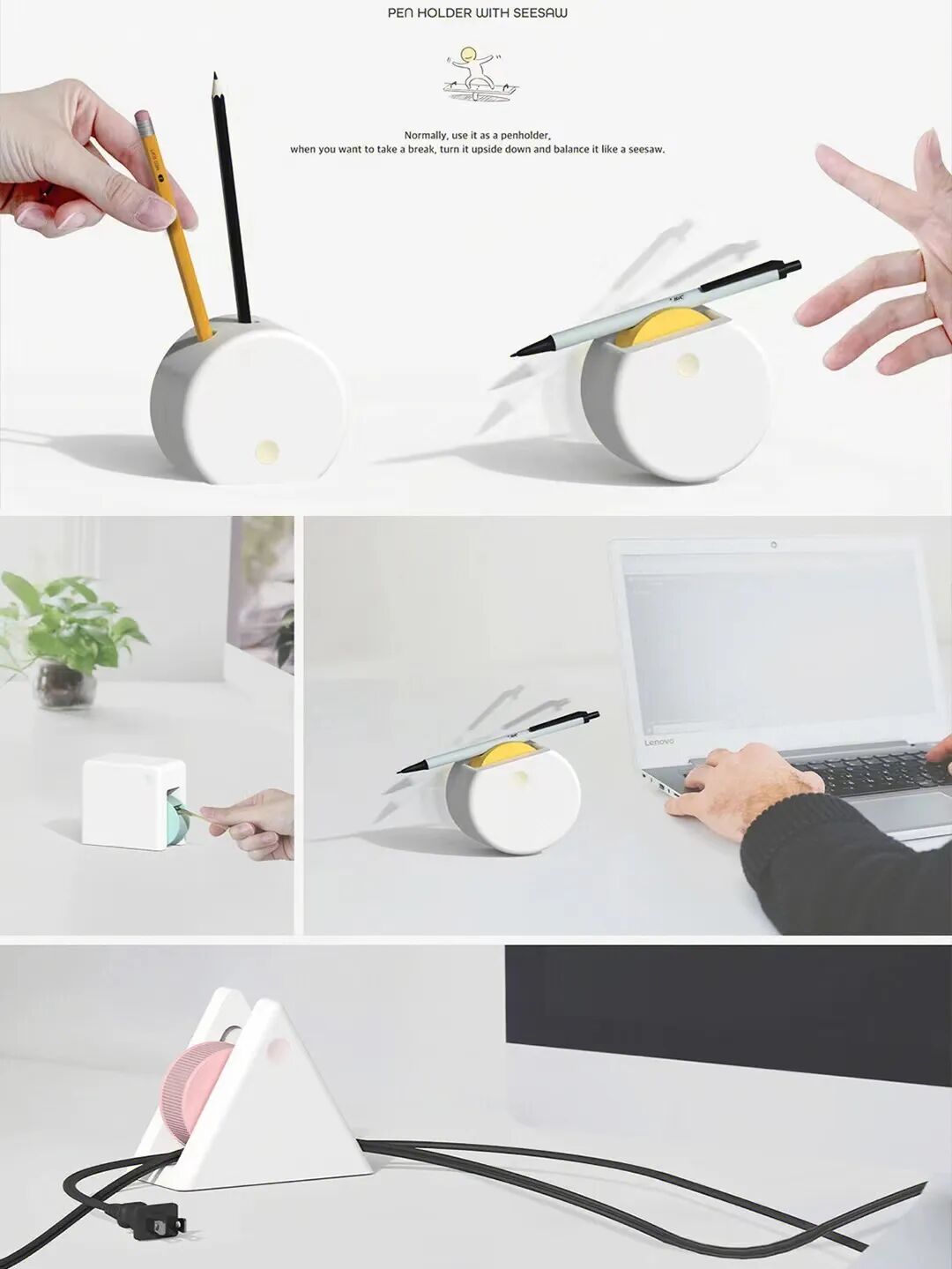 这些设计一定会在你的办公桌上占有一席之地:模仿秋千动作的胶带分配器;黄色的流行笔筒,它有一个可伸缩的底部,握笔时可以平放,翻转时,它会以跷跷板式的摇摆动作握住你的笔;一个三角形的绳索组织器,它也跟随我们小时候激动的上下滑动运动。
