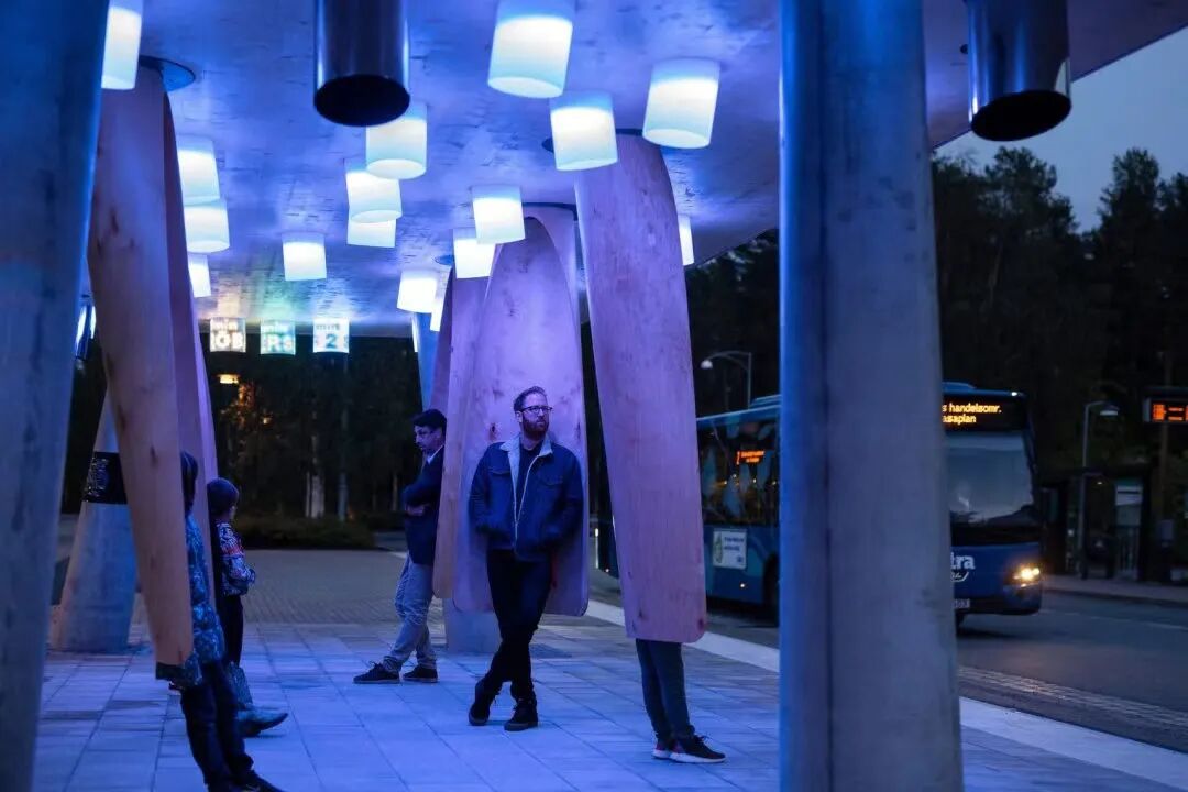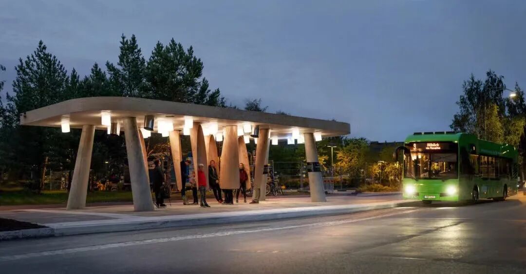 位于瑞典的一个交互式公交车站。这个公交车站的名字叫做“存在之地”,希望改善北极地区寒冷天气条件下乘坐公共交通工具乘客的候车条件。