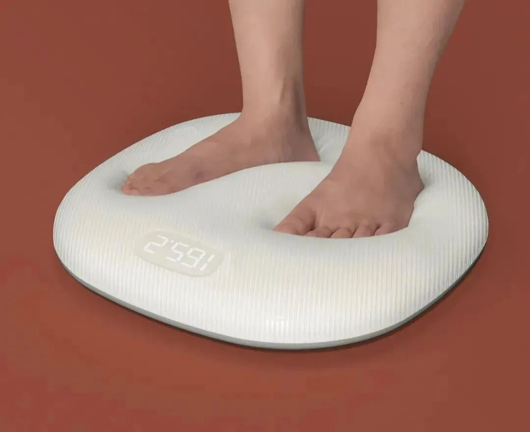 设计师考虑到了这个问题,通过把表面设计成软硅胶材质,让用户踩上去就像踩在一个圆鼓鼓的球体上,增加了全新的体验方式。同时你也能看到自己踩上去后体重计的凹陷程度,让重力可视化。