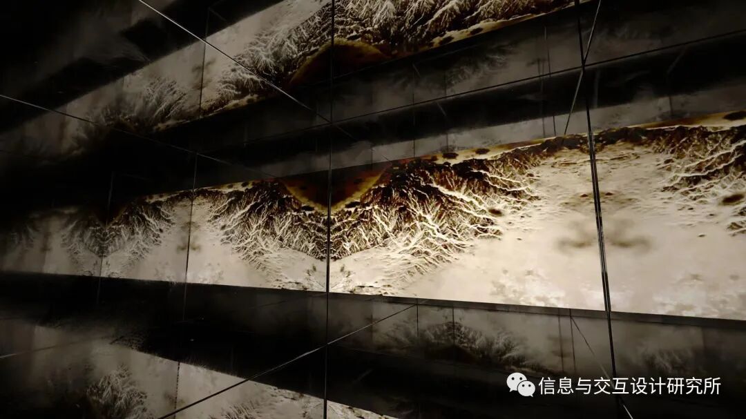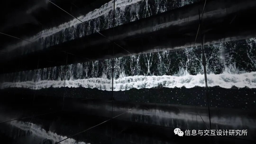 《无限梦境Inf- Dream World》 是一个更注重声音与视觉体验结合的空间,其数字影像部分一共分为梦、水、火、风、地、虚无,六个章节,共计九分钟,完全封闭的暗空间内的一面墙为投影播放的数字影像,剩余的墙面皆布置为镜面,空间内配备了2.1立体声音箱,观众身处空间中去感受视觉与听觉的碰撞,同时观众作为有能力控制空间内的视觉变化的角色成为了作品不可缺少存在。