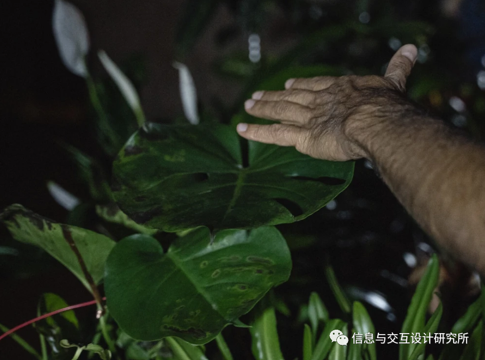 例如,叶子作为对象会对我们的触摸有哪些感知呢?对于这一问题LeandroSummo制作了这件作品,游客可能通过触摸和与植物互动,让植物感受到触摸感再通过光雕塑传递给人们。通过触摸树叶,植物以动作电位(等离子膜内部和外部电位差异的变化)的形式发出电信号,这些电位被电位计接收,放大并转换成能够拨号整个装置的信号。