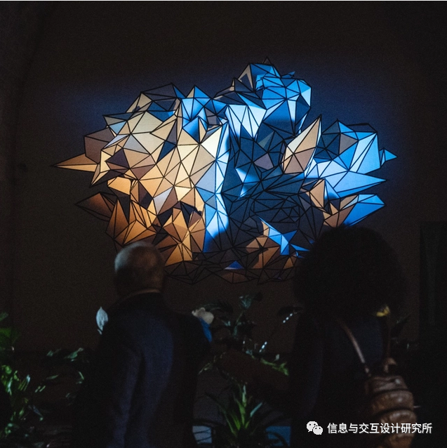 Simbiosi这个互动灯光雕塑塑造了不同的空间光感,感知形式是物理对象作为信息传递媒介的光媒介与用户参与之间相互作用的结果。