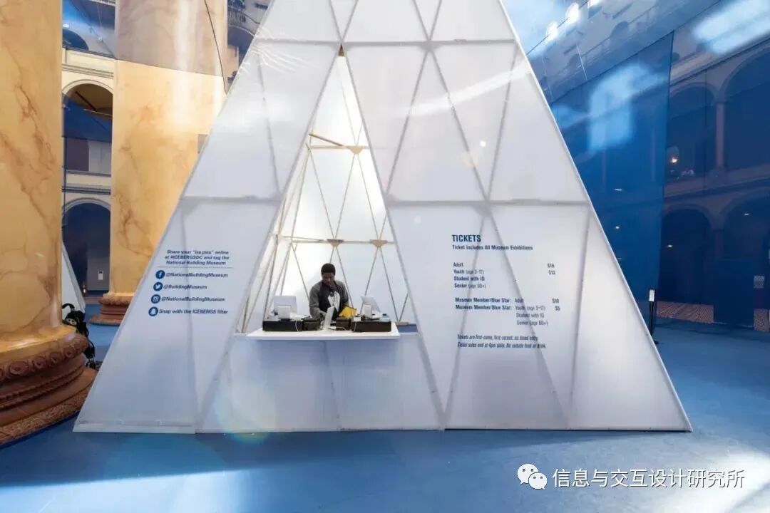 冰山以各种不同尺寸的装置元素为特色,并由可重复使用的建筑材料,如脚手架和聚碳酸酯镶板等这些通常用于温室建造的材料建造而成。该装置通过一条悬挂在20英尺高的“水平面”将垂直空间一分为二,同时以此保证“海洋”表面高处和高耸冰山下方的视野。这里面最高的冰山是“bergy bit”,它有56英尺高,将从水平面以上一直延伸到博物馆的三层阳台,冰山装置的总面积共达12540平方英尺。