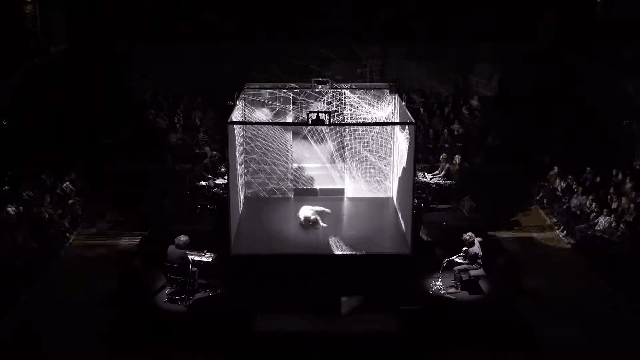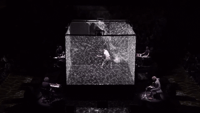表演者在立方体形状中翩翩起舞,在小立方体中投射出高科技和梦幻般的宇宙。