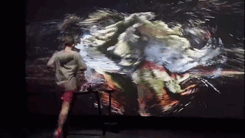 在“文字瀑布”这部作品中,观众会面对一个纯粹而强大的巨幅视景,他们可以透过自己的肢体与文字直接交流,任何细微的动作,都会引起文字瀑布的巨大反应,并呈现出字体粗细、大小和形状等细节变化。