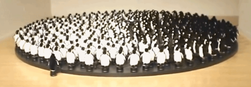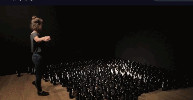 《企鹅镜》有黑白两面,由 450 个电动毛绒玩具组成,是一个散落在地板上的装置。静置的时候,企鹅镜呈黑色,毛绒玩具以背部面对游客。如果游客晃晃手,对应区域的小企鹅便乖巧的转圈圈,组成企鹅白白的肚皮则是游客的身形姿态。正如一面镜子巧妙的映照出你的动作。