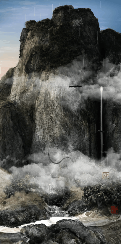 作品透过人、物、景和空间的相会,在展示的场域创造出一个超越时空的交结点,联结过去与未来,将范宽作画当下的时空,与现今的时空背景相连,透过新媒体的视觉表现与互动体验,搭建起穿梭古今虚实间的沟通与对话:“喂……喂……喂……”如回声般,聆听天地气韵与人的心灵共振,召唤出现代数字视觉经验中,潜藏于内在的物我交融的精神感知,也启发更多深入的探索和对未知的好奇与想象。