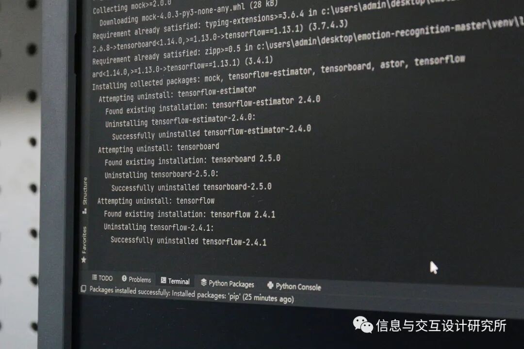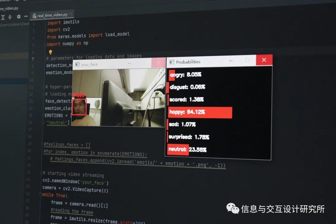 作品中的表情识别代码结合 TensorFlow 与 OpenCV 完成,它可以分析图像中的面部表情并输出不同情绪的比重数值。这些数值被链接到装置的气味生成部分,通过蓝牙模块让 Arduino 接收观众面部表情中的不同情绪数据,并用其驱动整个主体装置的运转。