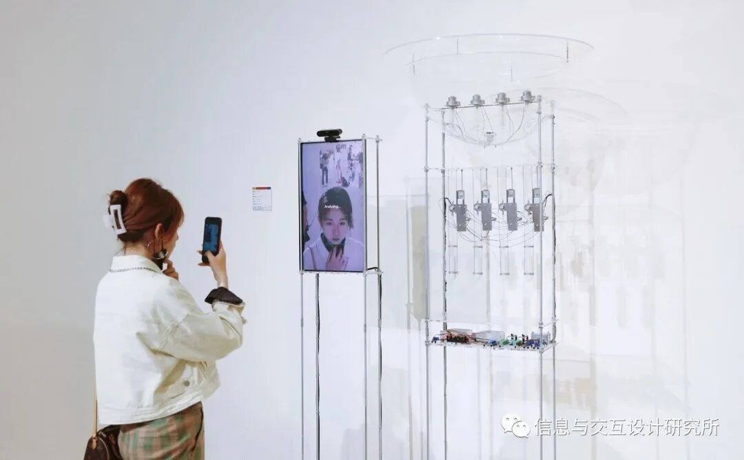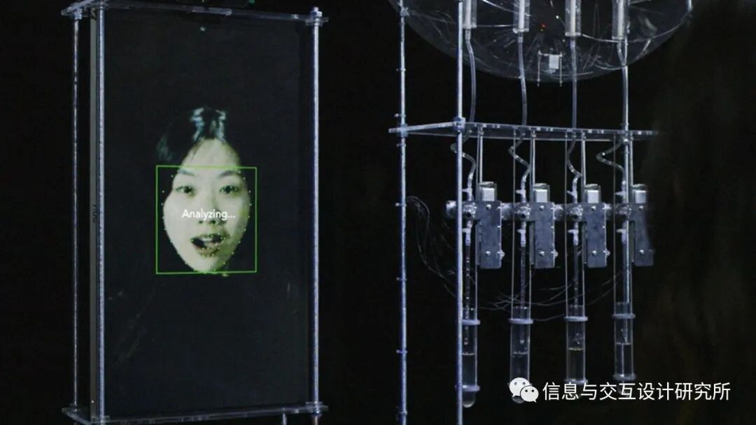 通过搭载的表情识别算法,它可以分析观众的面部表情并输出不同情绪的数值,同时基于这些情绪数值驱动装置运转抽取不同比例的气味液体雾化混合,将观众的表情转化为独一无二的气味。