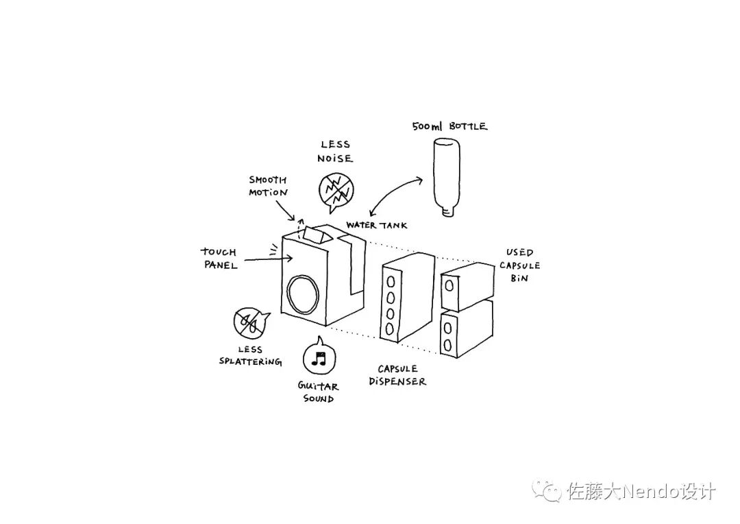 还设计了一个储存胶囊的盒子和一个扔掉用过的胶囊的盒子,这样胶囊可以完美地与机器对齐。最后,机器的设计提供了一个选择,将一个500毫升的塑料瓶直接放在机器上,而不是使用水箱,省去了灌装或清洗的需要。这个设计是为了与可口可乐日本公司的矿泉水“I LOHAS”产生协同效应。