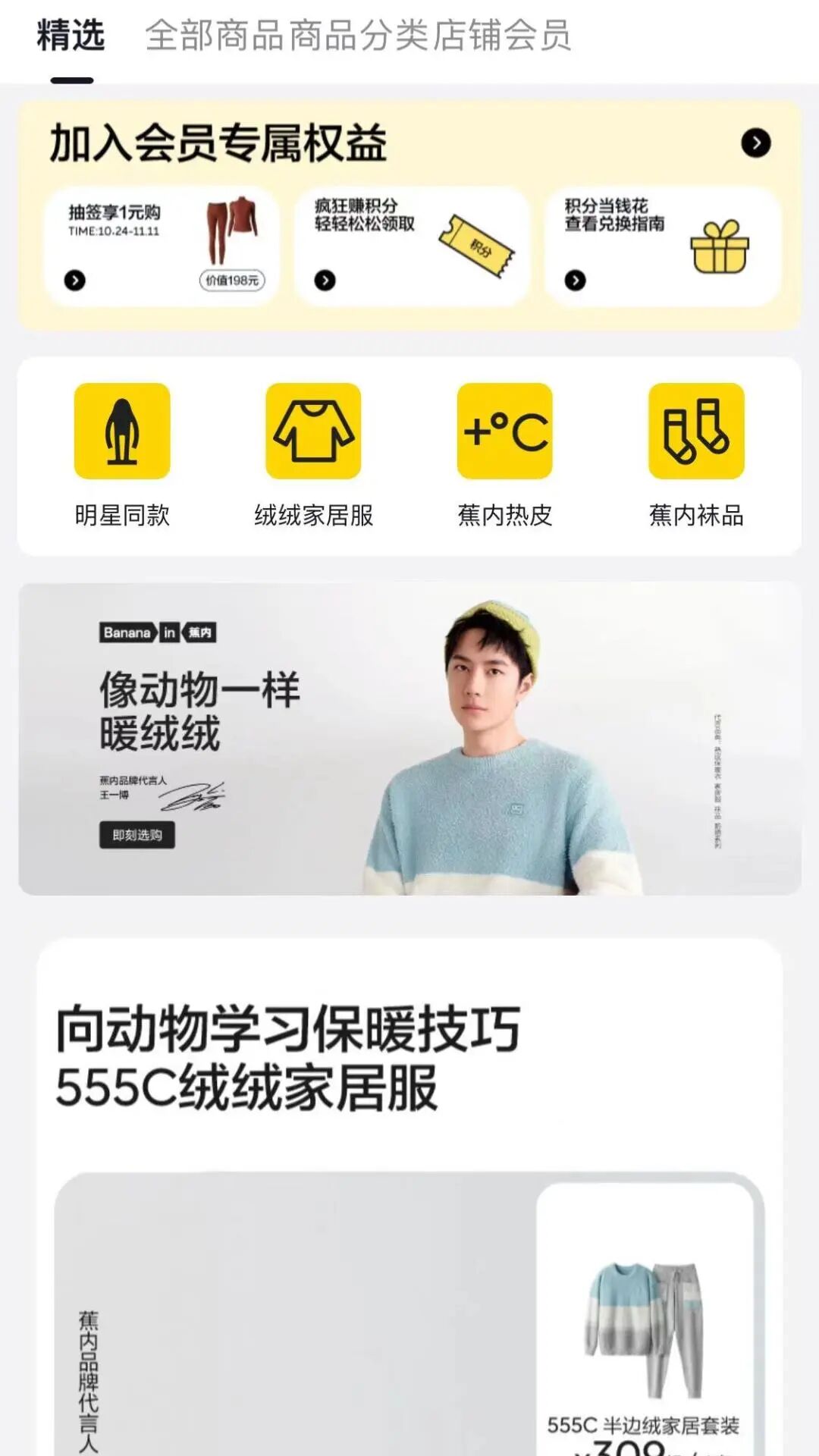 无论是微信小程序、抖音还是淘宝店铺,蕉内都较好地延用了ABCD为其做的品牌设计。得益于自身团队审美在线,且有相应的inhouse设计团队对其进行应用。