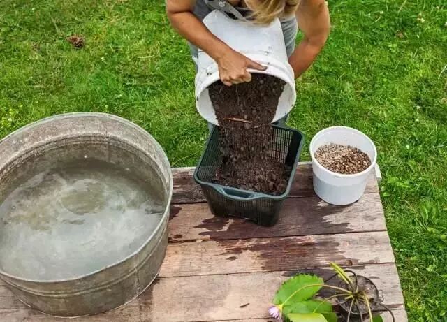 步骤1:选择一个晴朗的环境(最少每天有6个小时的阳光),在容器里的填满水,水生植物是需要一些肥力的,所以一定要在盆底添加颗粒肥料,再加入塘泥。(这里选的是50厘米深、70厘米直径的容器)