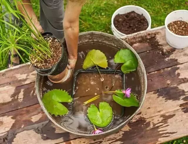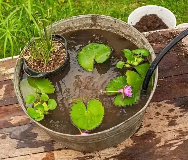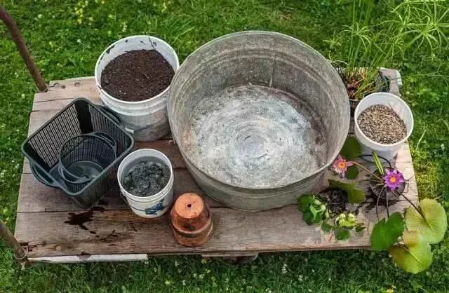 可以选择木桶、大水缸、无孔的打陶盆,甚至是混凝土制作的水槽,但是最好有40~50厘米深,直径有70~90厘米最好。