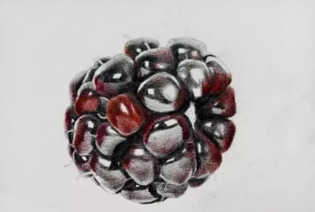 第六步开始对亮部进行揉色过渡,各位可以使用淡雅色系的彩铅笔来做过渡,这样也能良好的体现出桑葚的体积感。