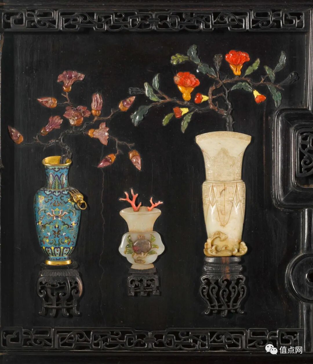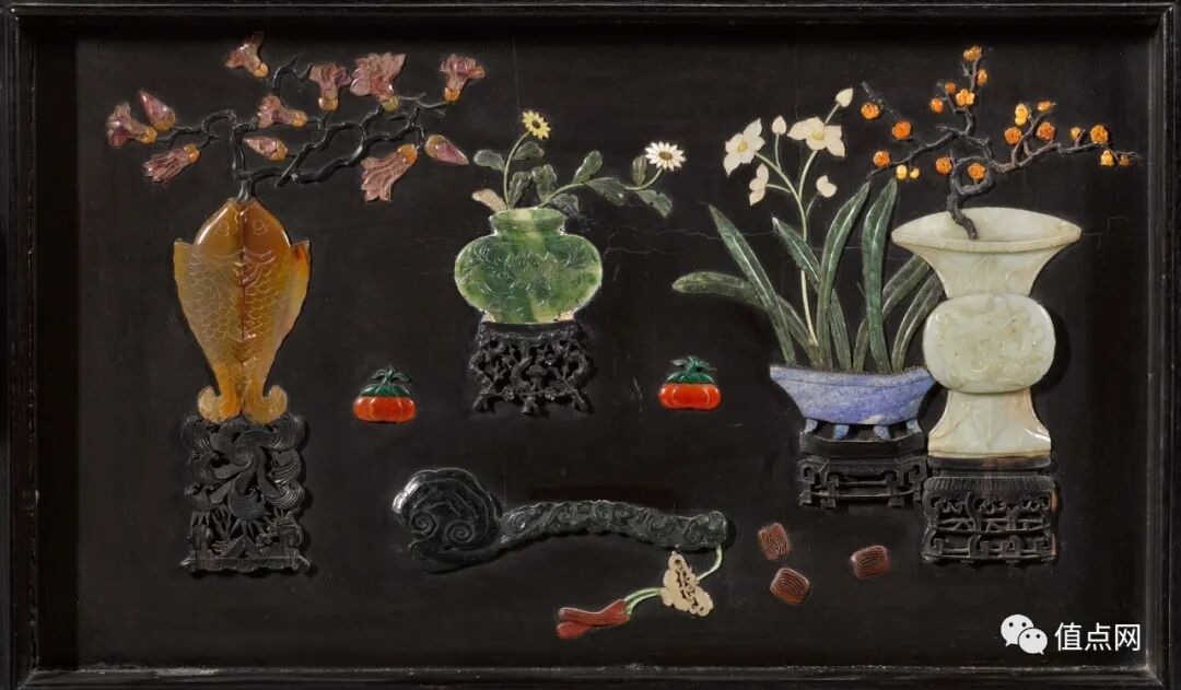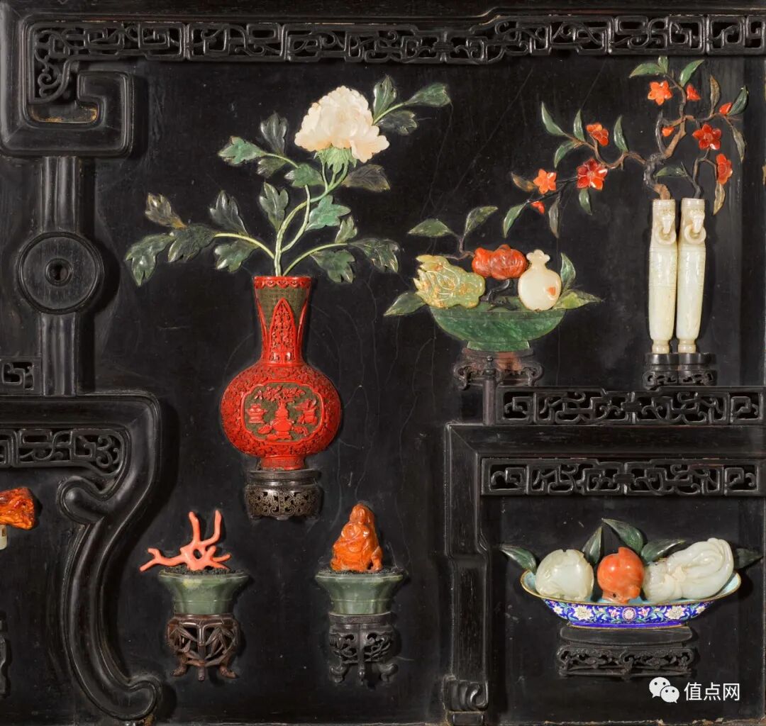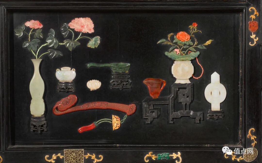 以本对座屏为例,即以各种玉石和珍贵材质嵌成博古图,器物之多让人眼花撩乱,包括造型巧妙的双鱼花瓶、犀角杯、玉圭、玉磬、如意、景泰蓝等等。