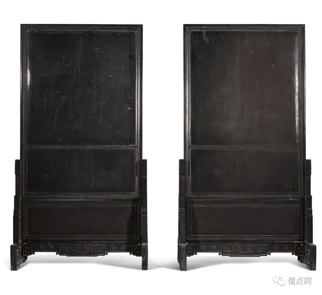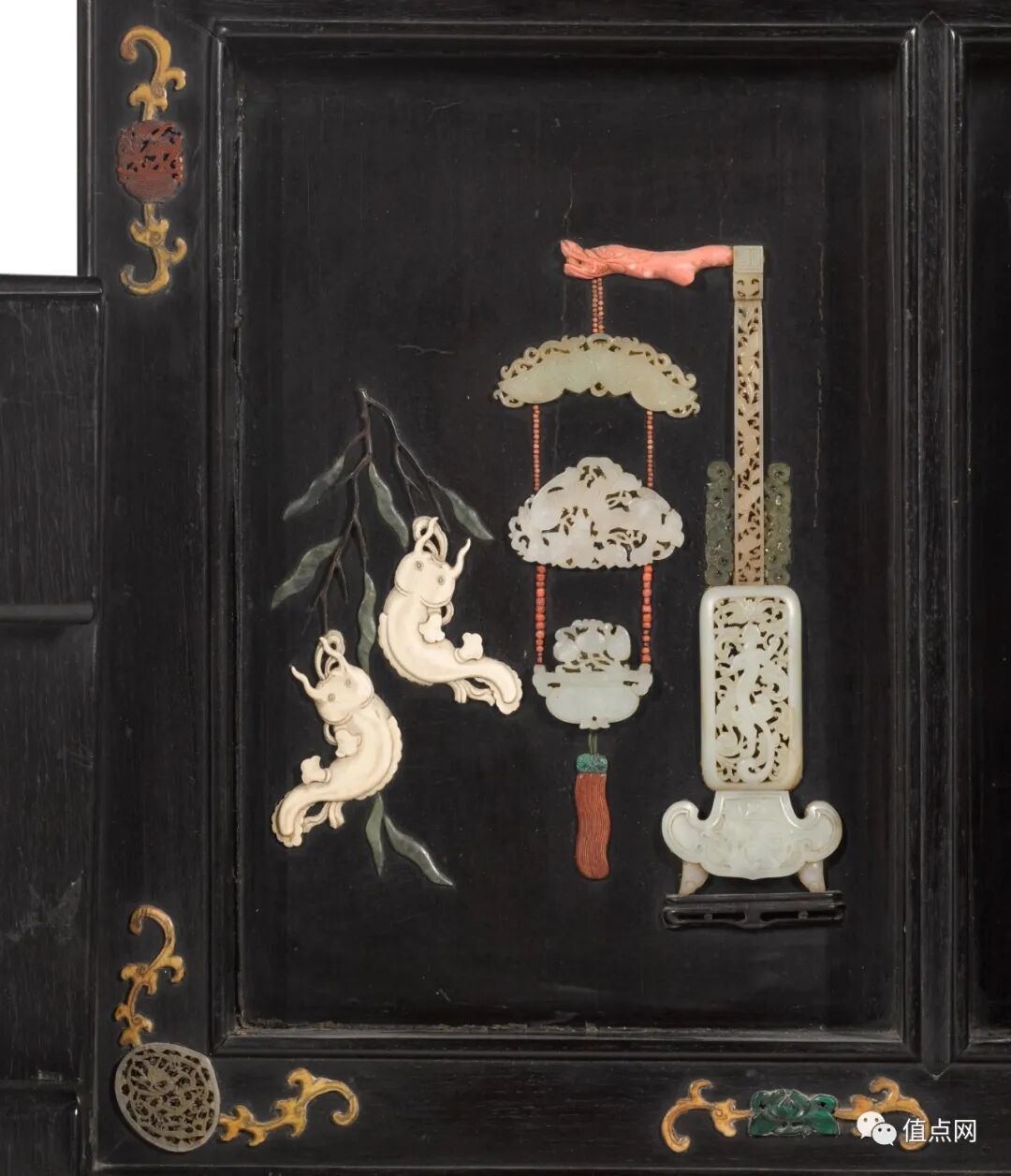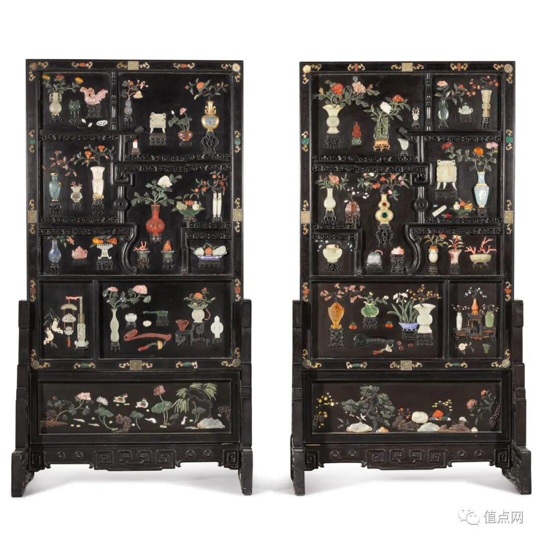 以本对座屏为例,即以各种玉石和珍贵材质嵌成博古图,器物之多让人眼花撩乱,包括造型巧妙的双鱼花瓶、犀角杯、玉圭、玉磬、如意、景泰蓝等等。