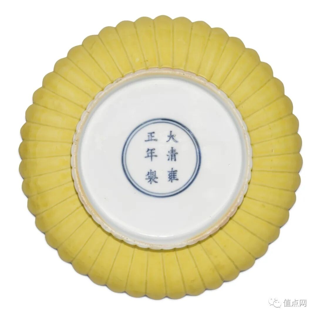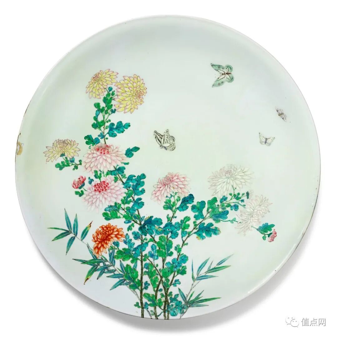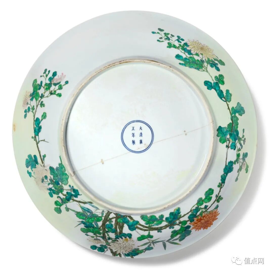 此粉彩大盘品相颇有需留意之处,尤其是从底部可见,碟心中间曾经裂开。