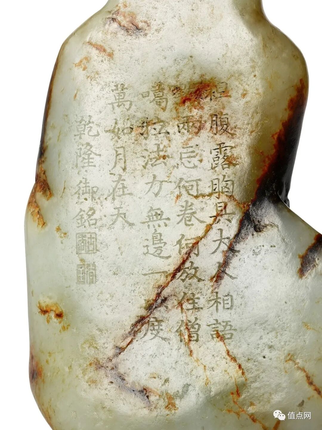 此玉罗汉断代为「明/清乾隆」,并非明代或清乾隆的意思,而是行方判断玉器本身是明朝所制,而御制诗是乾隆时刻上去的,译文为: