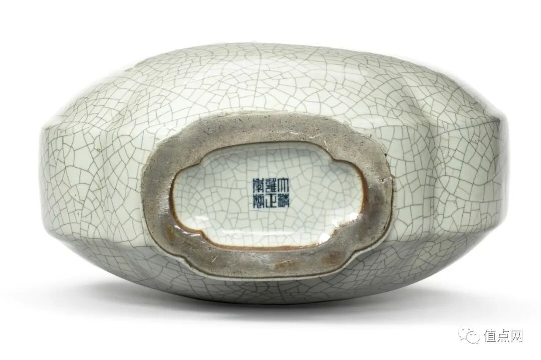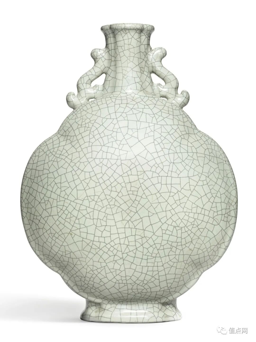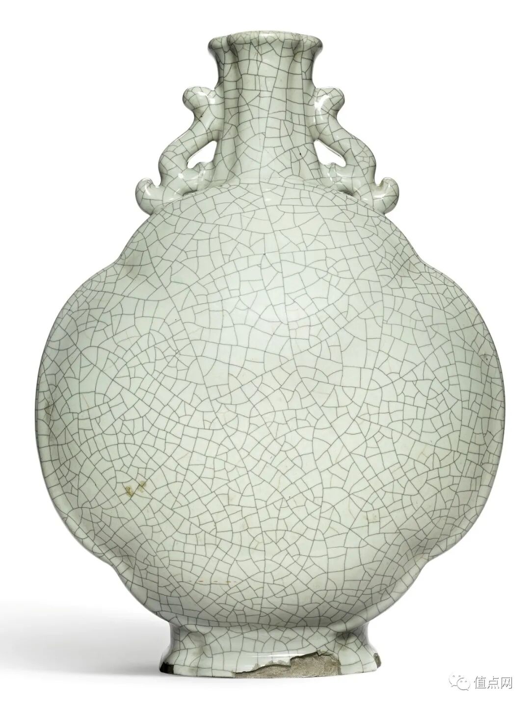 抱月瓶创烧于明代,器形源自西亚地区金属器。曲线圆滑,颈部细直,附带双耳,器腹扁圆,故得名扁壶。由于形似满月,又雅称抱月瓶,海棠式则为后来变化出来的形状。观官方图片,本瓶除了近足处以外,口沿至颈部亦似乎有破损。