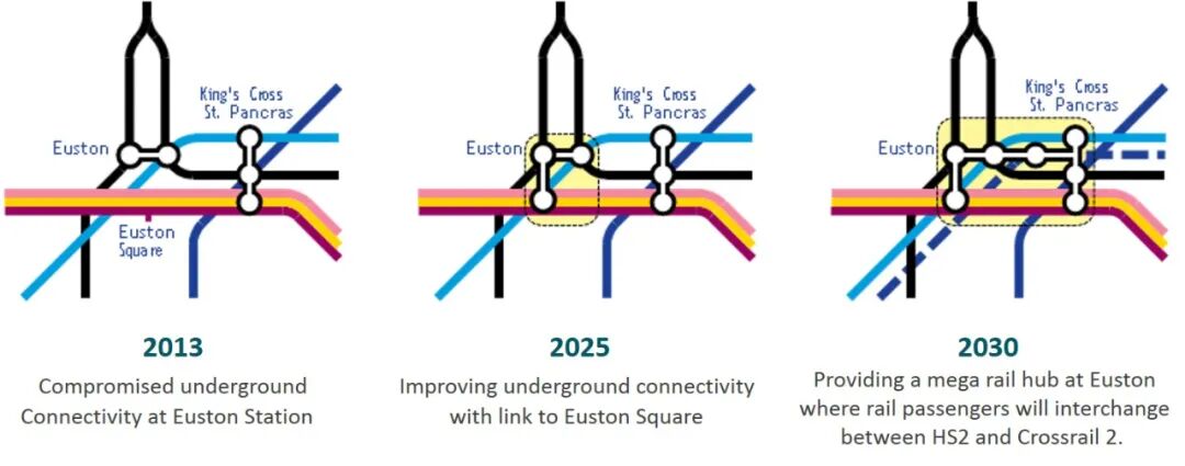 在车站的改造和扩建过程中,我们同时被要求在不大范围影响车站运营和当地市政道路运营和周边社区的前提下,建立一个世界级的交通导向综合开发项目,并与尤斯顿区域历史文化城市肌理相融合。到2030年,尤斯顿站将被建成一个在地下与尤斯顿广场站和国王十字圣潘可拉斯火车站相通的巨型复合功能交通枢纽。