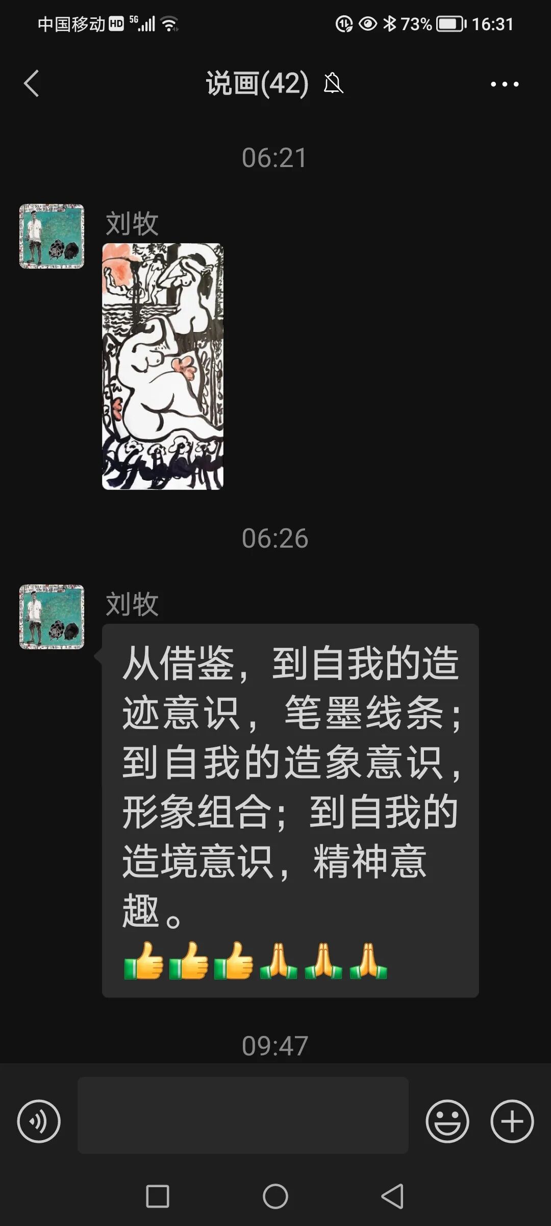 刘牧:@刘意乐画(新华) 先是要语言,然后是达到高级境界的语言。这个可以看一看韩羽、聂干因的语音,乃至丁雄泉、朱新建,甚至包括田黎明。仔细想想他们迹、象境;元素、运行到系统的建立和完成。[合十][合十][合十][抱拳][抱拳][抱拳]