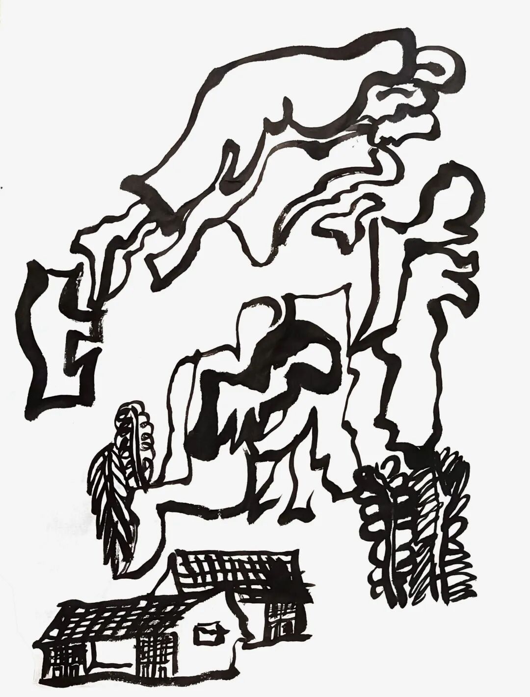 刘牧:新华,你现在画的就是三级线,语言感觉很好!你在想办法用自己的笔意,迹特殊的感觉,从书法中找到的那种特殊的感觉,组合成你需要的特殊象,完成一种特殊的境。现在就很棒,继续!继续!你的笔墨语言,一定能找到一个独到的特别好的感觉和体会。