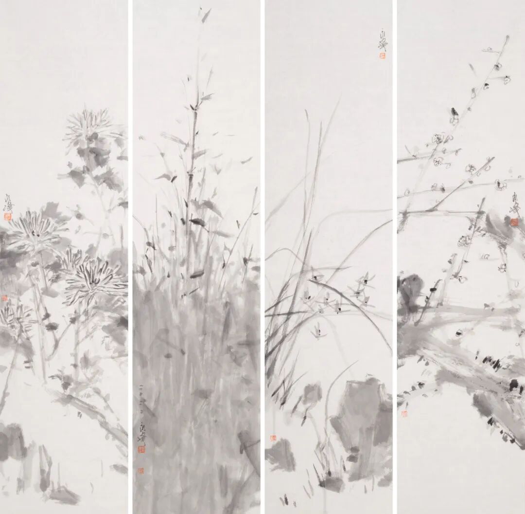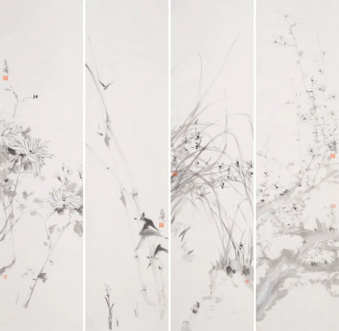 梅兰竹菊2 ║ 138cm×34cm×4 ║纸本设色 ║ 2022年
